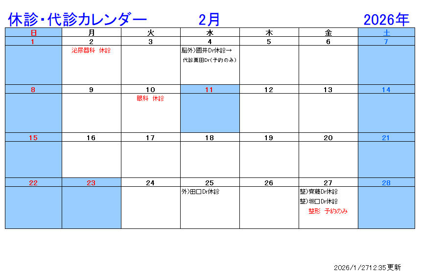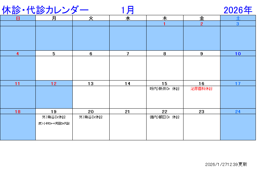 最新の休診情報は、各診療科にお問い合わせください。お問い合わせは TEL:028-653-1001(代表)