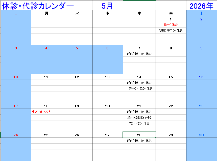 最新の休診情報は、各診療科にお問い合わせください。お問い合わせは TEL:028-653-1001(代表)