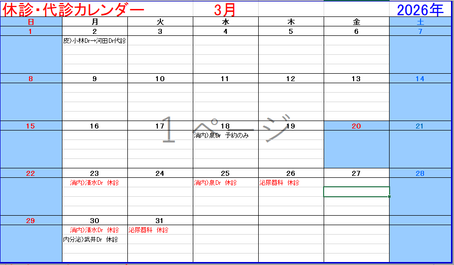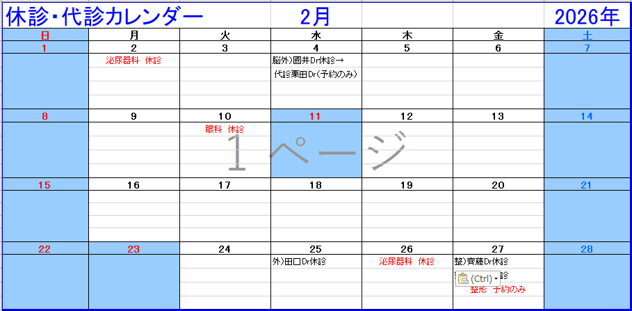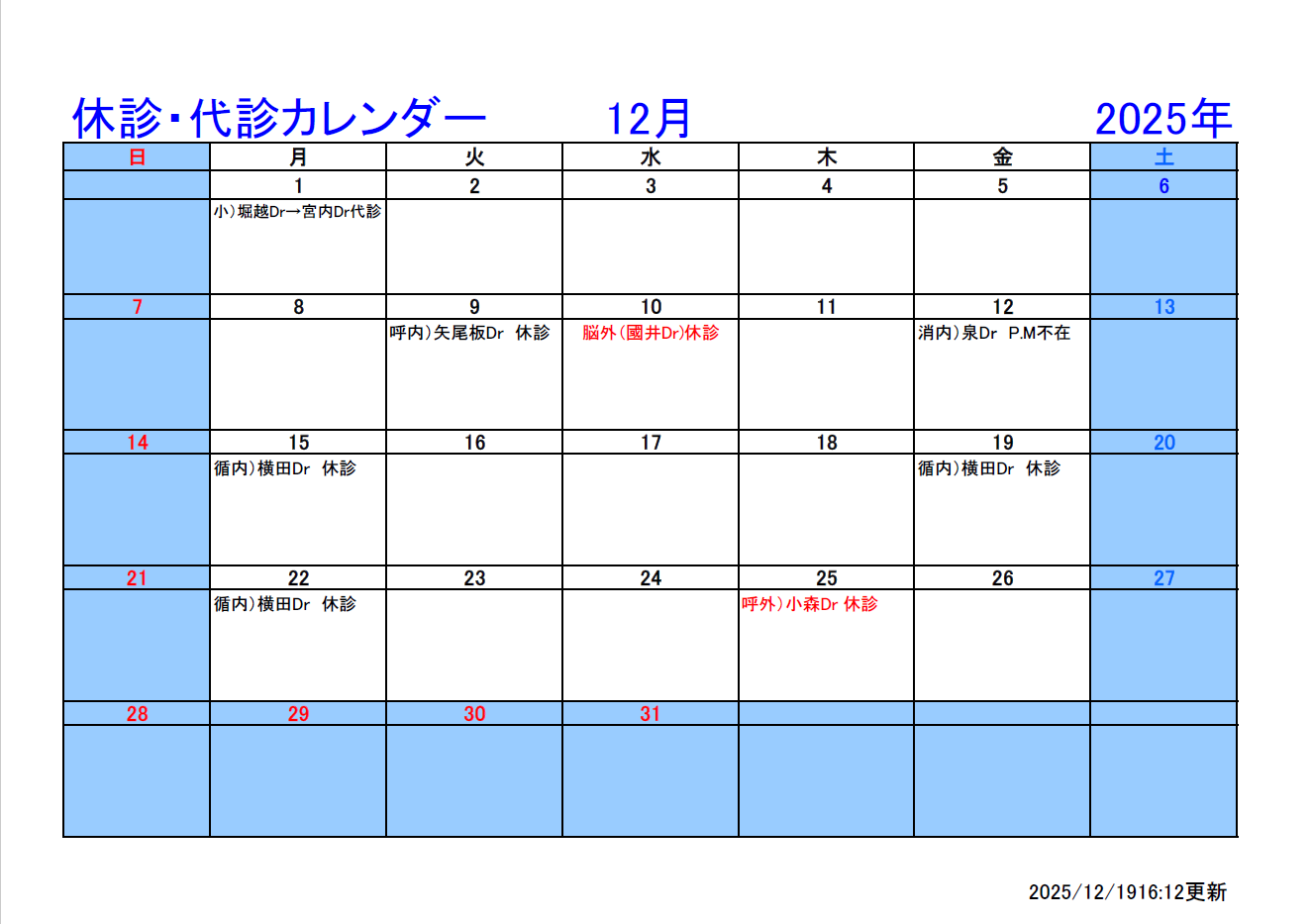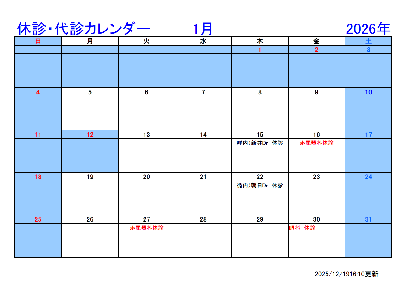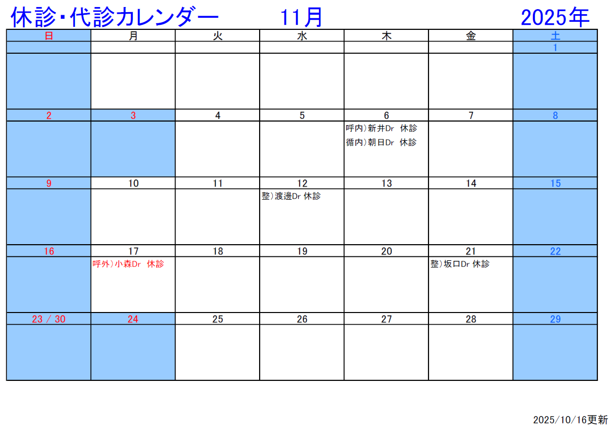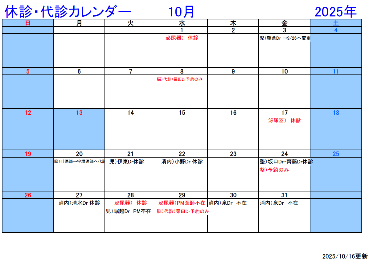 最新の休診情報は、各診療科にお問い合わせください。お問い合わせは TEL:028-653-1001(代表)
